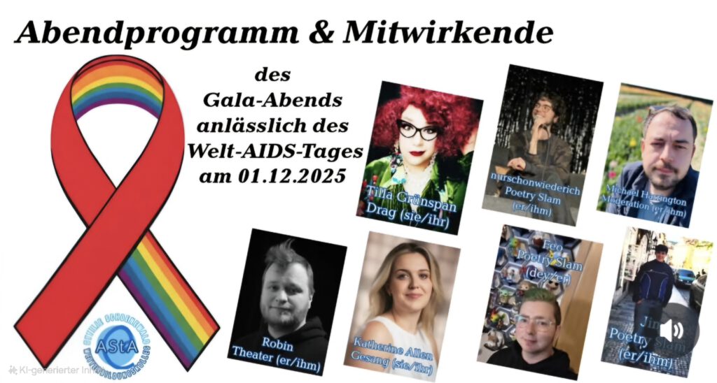 Anlässlich des Welt-AIDS-Tages am 1.12.25um 19 Uhr findet nun schon zum dritten Mal ein Gala-Abend in der Ottilie statt. Wir erwarten einen Abend mit Gesang, Poetry-Slam, Theater, Drag….Wir freuen uns!
